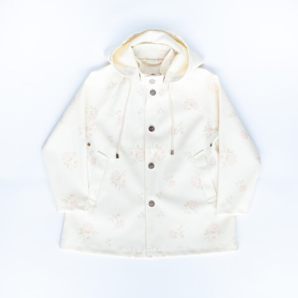 Membrana PU , 100 % wodoodporna tkanina. Metalowe guziczki z logo Petit Coco oraz bawełniane sznureczki do ściągania w kapturze.
